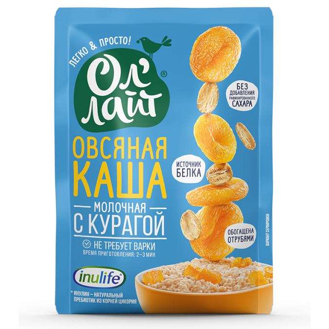 Состав: хлопья овсяные, фруктоза, курага, молоко сухое обезжиренное, инулин Fibruline (Бельгия), отруби овсяные, соль, ароматизатор натуральный.