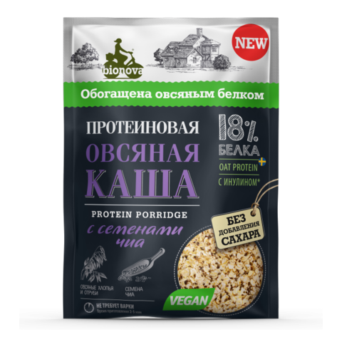 Состав: хлопья овсяные цельнозерновые, высокоочищенный изолят горохового белка Pisane (Бельгия), отруби овсяные, семена чиа, пищевое волокно из цикория - инулин Fibruline (Бельгия), соль пищевая, подсластитель сукралоза.