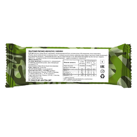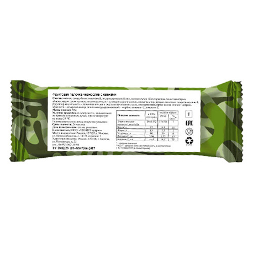 Состав: сухофрукты (чернослив), сахар, орехи (арахис, фундук), регулятор кислотности - кислота лимонная. На предприятии перерабатываются: кунжут, сельдерей, злаки с глютеном, соя, молоко.