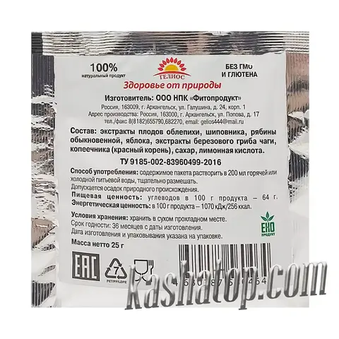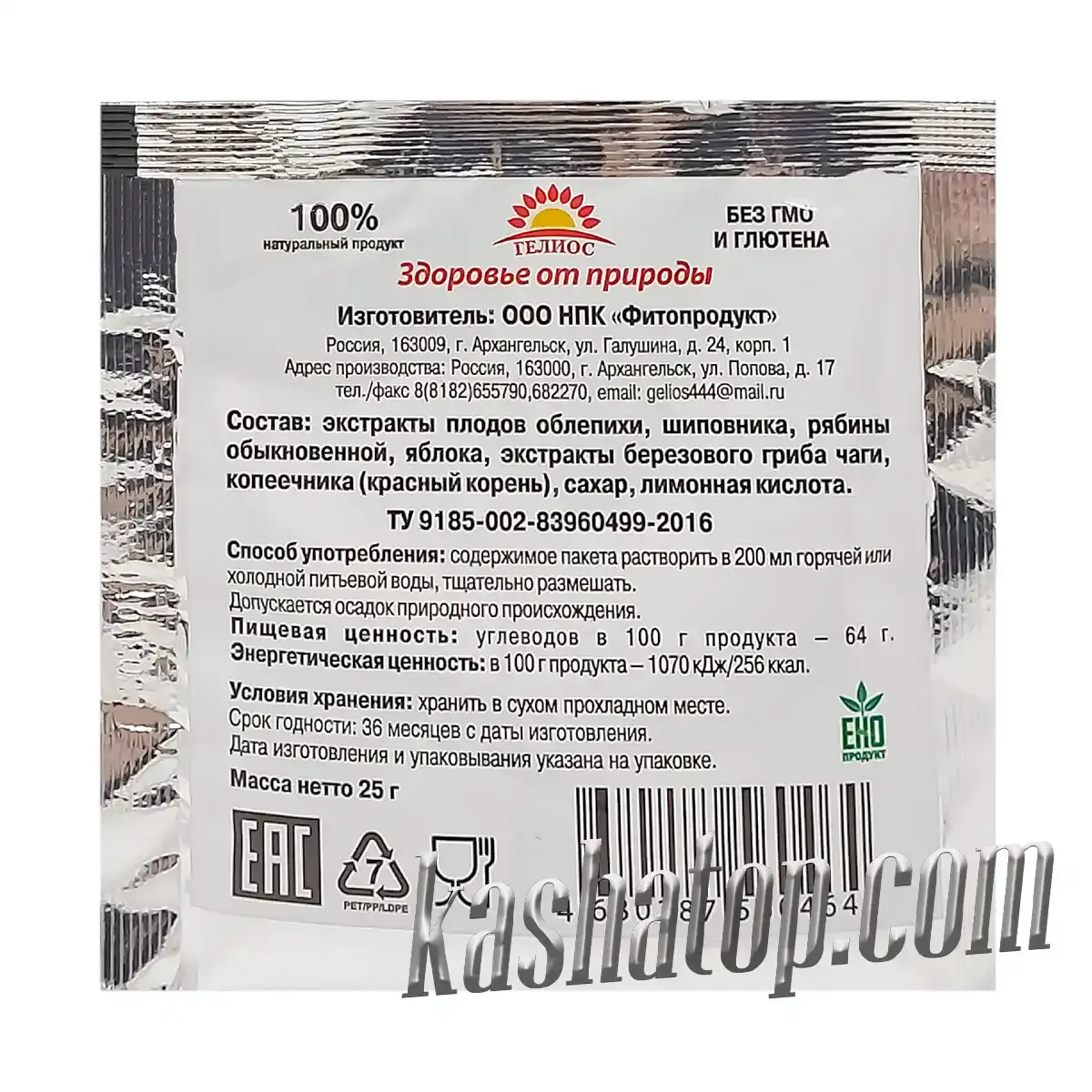 Состав: экстракты плодов облепихи, шиповника, рябины обыкновенной, яблока, экстракты берёзового гриба чаги, копеечника (красный корень), сахар, лимонная кислота.